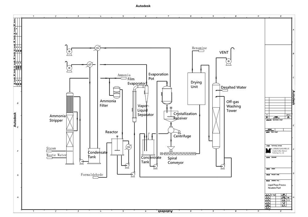 En el proceso de reacción en fase líquida se utiliza una solución de formaldehído al 37% y amonio. Posterior a la mezcla de ambos compuestos, esta solución se deshidrata por evaporación. El siguiente paso es utilizar la centrífuga y el dispositivo de secado con la finalidad de obtener hexamina. Este proceso es avanzado y al mismo tiempo sencillo de realizar. Debe tomarse en cuenta que debido al proceso de deshidratación por evaporación, el periodo de cristalización es prologando, dando como resultado partículas de urotropina más grandes.